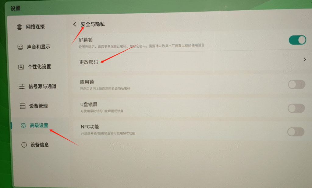 After unlocking the device, navigate to Settings — Advanced Settings — Security & Privacy to configure a new lock screen password.